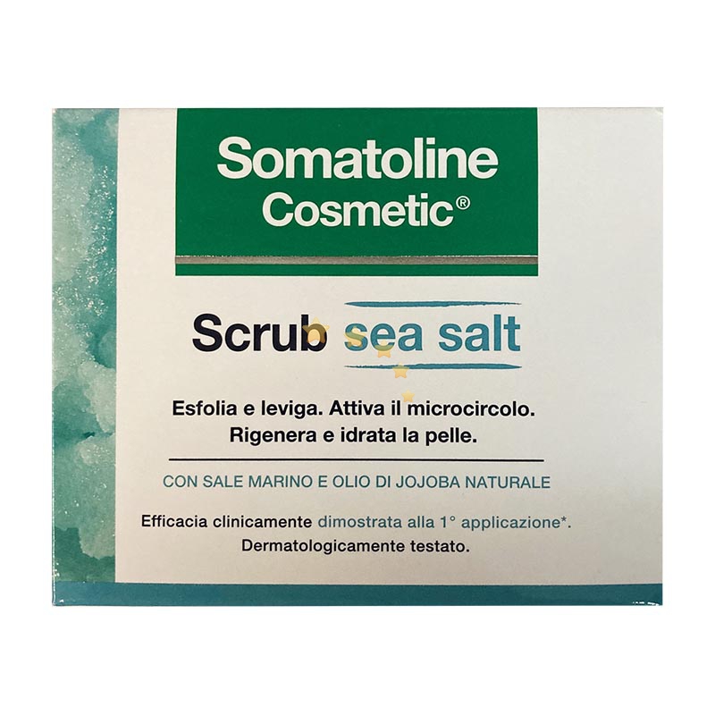 Somatoline Cosmetic Scrub Sea Salt è lo scrub esfoliante che rigenera e prepara la pelle al trattamento corpo. Formula dall’essenza balsamica e avvolgente con Sale Marino, Olio di Jojoba, Olio di Germe di Grano e Vitamina E.
